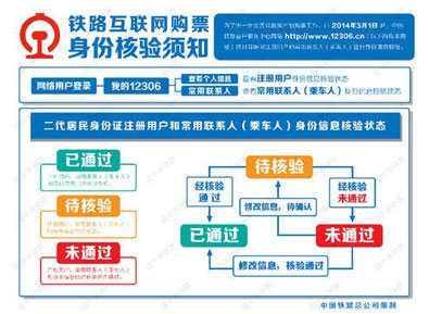 身份信息核驗狀態(tài)為“已通過”、“預(yù)通過”的注冊用戶和常用聯(lián)系人,可在12306網(wǎng)站正常辦理購票業(yè)務(wù);其他狀態(tài)的注冊用戶和常用聯(lián)系人需要確認(rèn)在12306網(wǎng)站所填信息的正確性,或持相關(guān)證件原件到車站窗口或代售點(diǎn)辦理身份信息核驗。12306網(wǎng)站提示“身份信息重復(fù)”的注冊用戶,用戶本人(不可代辦)須持在網(wǎng)站注冊時填寫的有效身份證件原件,到車站售票窗口辦理。